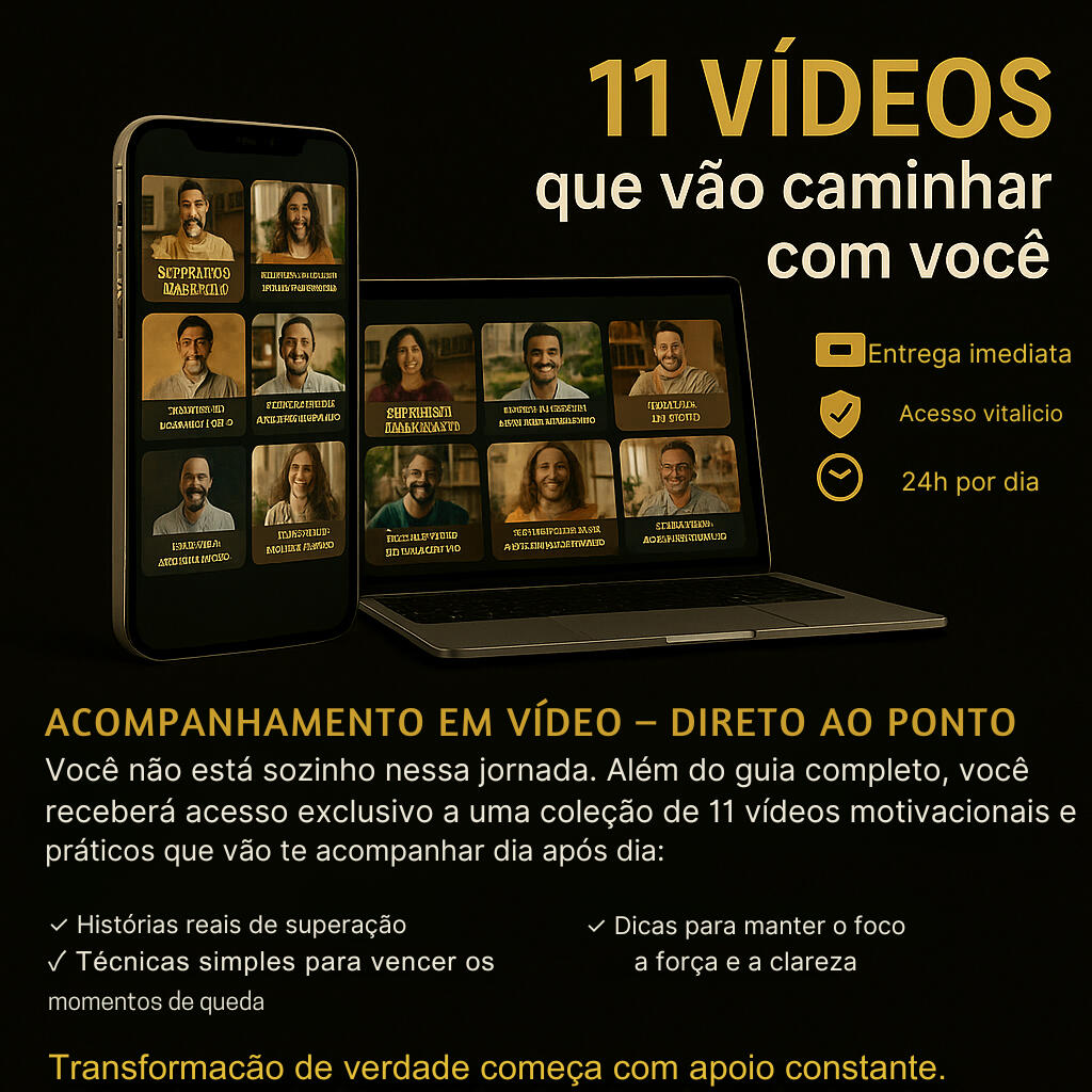 BÔNUS EXCLUSIVO: 11 Vídeos de Apoio e InspiraçãoAo adquirir o e-Book, você recebe acesso a uma seleção especial de 11 vídeos com:• Histórias reais de superação